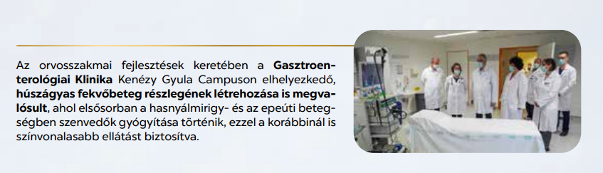 Papp Mária elmondta, hogy a Gasztroenterológiai Klinika húsz év alatt, 2021-ben érte el azt, hogy önállóvá váljon, és hogy még magasabb színvonalú betegellátást lehessen megvalósítani. Többek között huszonkét orvos és hetvenöt szakdolgozó tevékenykedik az intézményben, ahol évente háromezer fekvőbeteget látnak el kilencven százalék fölötti ágykihasználtság mellett, ami az igazgató szerint alátámasztja a klinika létjogosultságát. Hozzátette: mintegy negyvenötezer beteg ellátásáról gondoskodnak, emellett 16 ezer endoszkópos eljárást végeznek évente.